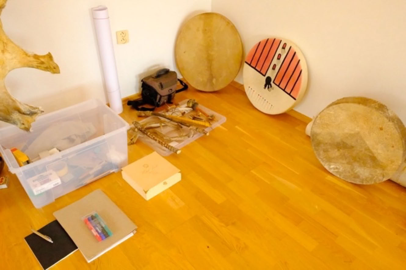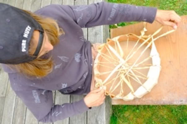 všetok materiál na výrobu bubna: drevený rám, kožu a ďalšie potreby a náradie